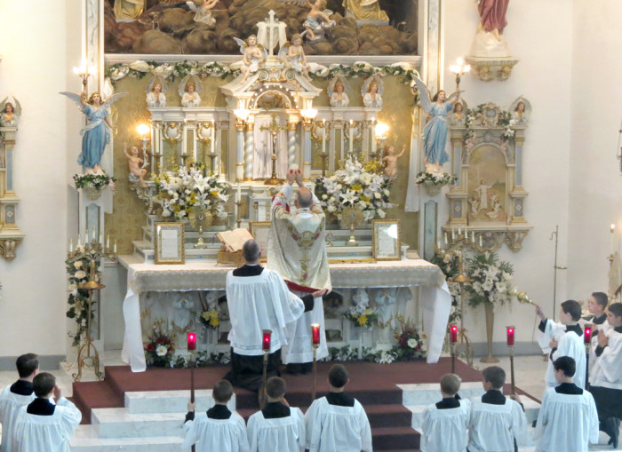 Some people object that they don’t get much out of the traditional Latin Mass, that it is “boring” because they don’t understand the Latin, that the priest doesn’t make the service interesting by getting the people involved — that he even has his back turned to them most of the time, that there is no music or they would prefer more “upbeat,” modern music, etc. What they forget is that the Mass is not meant to please man but to give glory to God. Worship is not a social gathering intended to give us a warm, fuzzy, neighborly feeling inside. It is an acknowledgement of God’s sovereignty and His infinite perfections, and an expression of our submission to Him as creatures to their Creator and Lord. As the catechism teaches, the purposes for which Mass are offered are: first, to adore God as our Creator and Lord; second, to thank God for His many favors; third, to ask God to bestow His blessings on all men; fourth, to satisfy the justice of God for the sins committed against Him. The Mass is, moreover, the public worship offered by the entire Church to God through Jesus Christ Who, as the Eternal High Priest, offers Himself anew to His Eternal Father as He did on the cross. He is the Lamb of God, the spotless Victim Whose sacrifice takes away the sins of the world, “standing as it were slain” (Apoc. 5,6) — that is, offering to His Heavenly Father again the sacrifice of His life on the cross. The Mass, then, is the fulfillment of the prophecy: “From the rising of the sun even to the going down…in every place there is sacrifice and there is offered to my name a clean oblation” (Mal. 1:11).